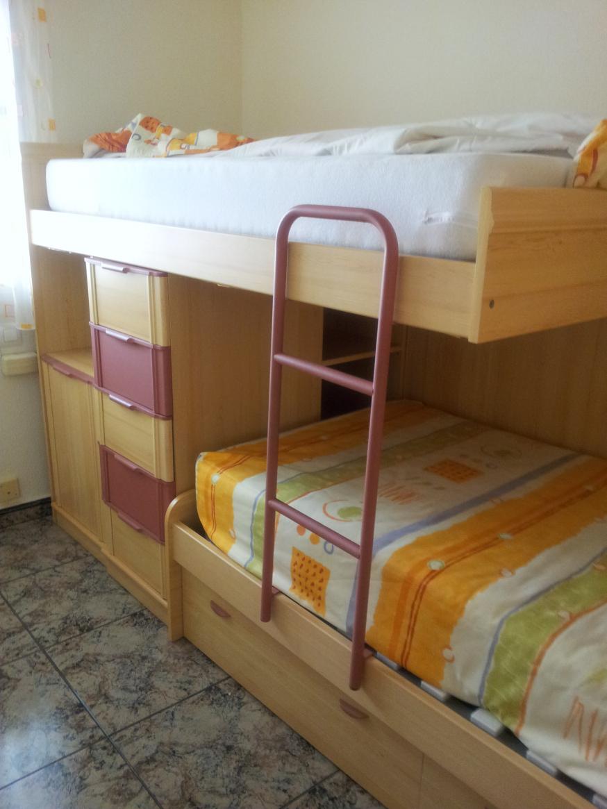 Vi vill sälja en superfräsch, så gott som oanvänd våningssäng med jättebra resårmadrasser och med många praktiska förvaringsutrymmen. Madrasserna är 90 cm breda och 1,90 resp. 1,80 långa. Vi monterar ner sängen och den finns för avhämtning nära Playa de los Naufragos. Pris: 200 euro.